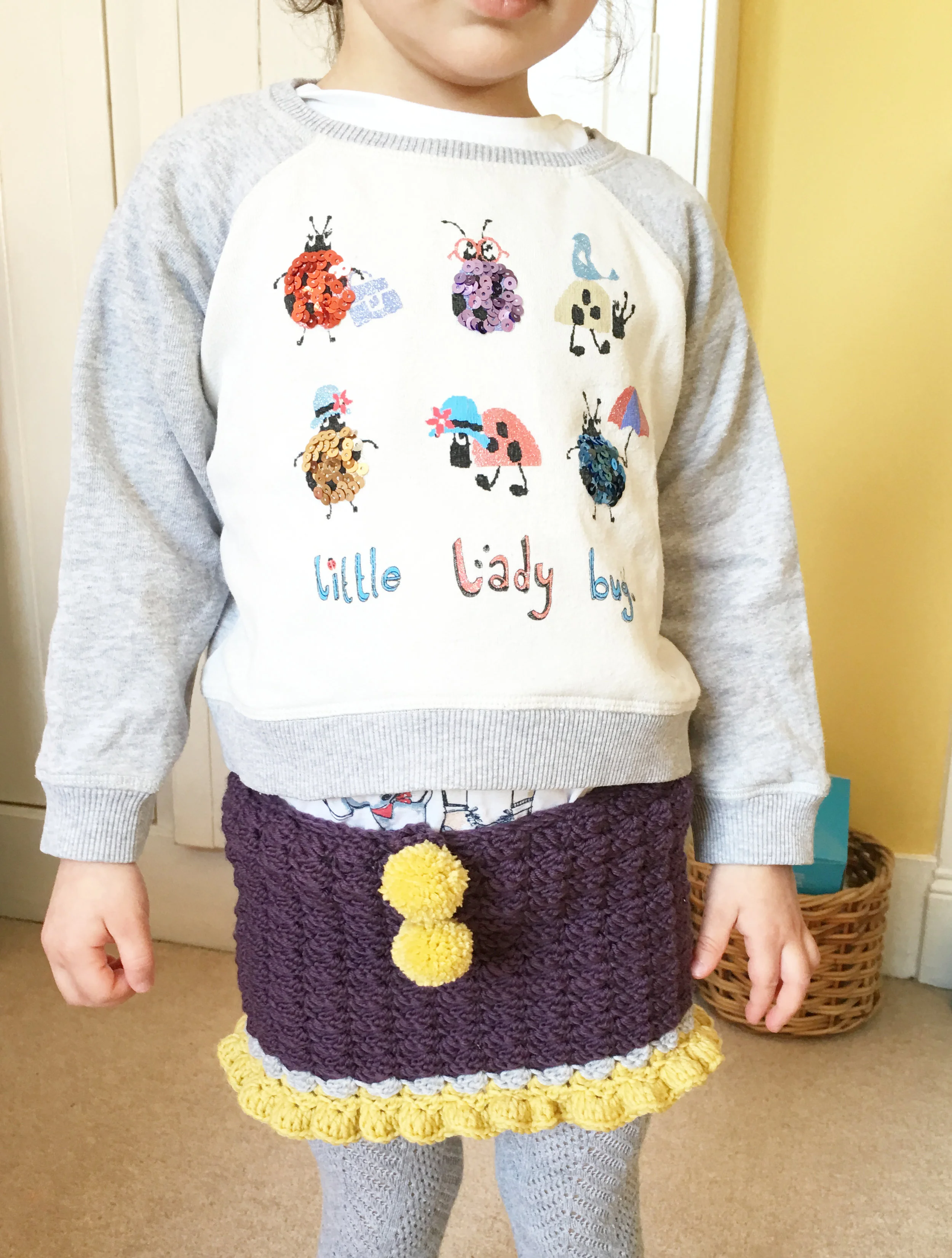 I designed this skirt with Betsy in mind, Betsy who is both super girly and madly acrobatic. Betsy who wants to wear a skirt but not be fussing around with it all the time. I rate the pattern as easy and suitable for beginners; you work the main body of the skirt back and forth into a rectangle and sew up with a back seam at the end. The simple cross hatch style stitch gives lots of stretch to the fabric whilst the pompom ties make it fun. Personally though, I would faint clean away if someone gave me a skirt with a frilled crochet hem? Wouldn't you?